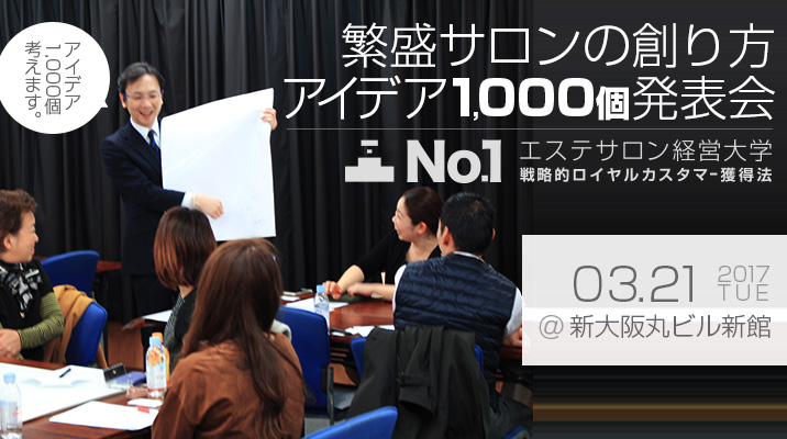 お知らせ 第12回 No.1エステサロン経営大学 開講 2017年2月24日 2017年3月21日 第12回 No.1エステサロン経営大学 開講します。 新大阪丸ビル新館 12:15 – 16:00 Facebookイベントページ No.1エステサロン経営大学 とは Facebookイベントページ 投稿ナビゲーション 第9回 安川塾 繁盛サロンの創り方実践塾 開講 お知らせ 一覧へ
