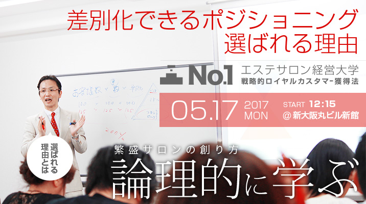 お知らせ 差別化できるポジショニング 選ばれる理由|第2回/第2期 No.1エステサロン経営大学 開講 2017年4月24日 2017年5月15日 第2回/第2期 No.1エステサロン経営大学 開講します。 新大阪丸ビル新館 12:15 – 16:00 Facebookイベントページ No.1エステサロン経営大学 とは Facebookイベントページ 投稿ナビゲーション 第11回 安川塾 繁盛サロンの創り方実践塾 開講繁盛サロンの創り方実践塾 第12回 安川塾 開講 お知らせ 一覧へ